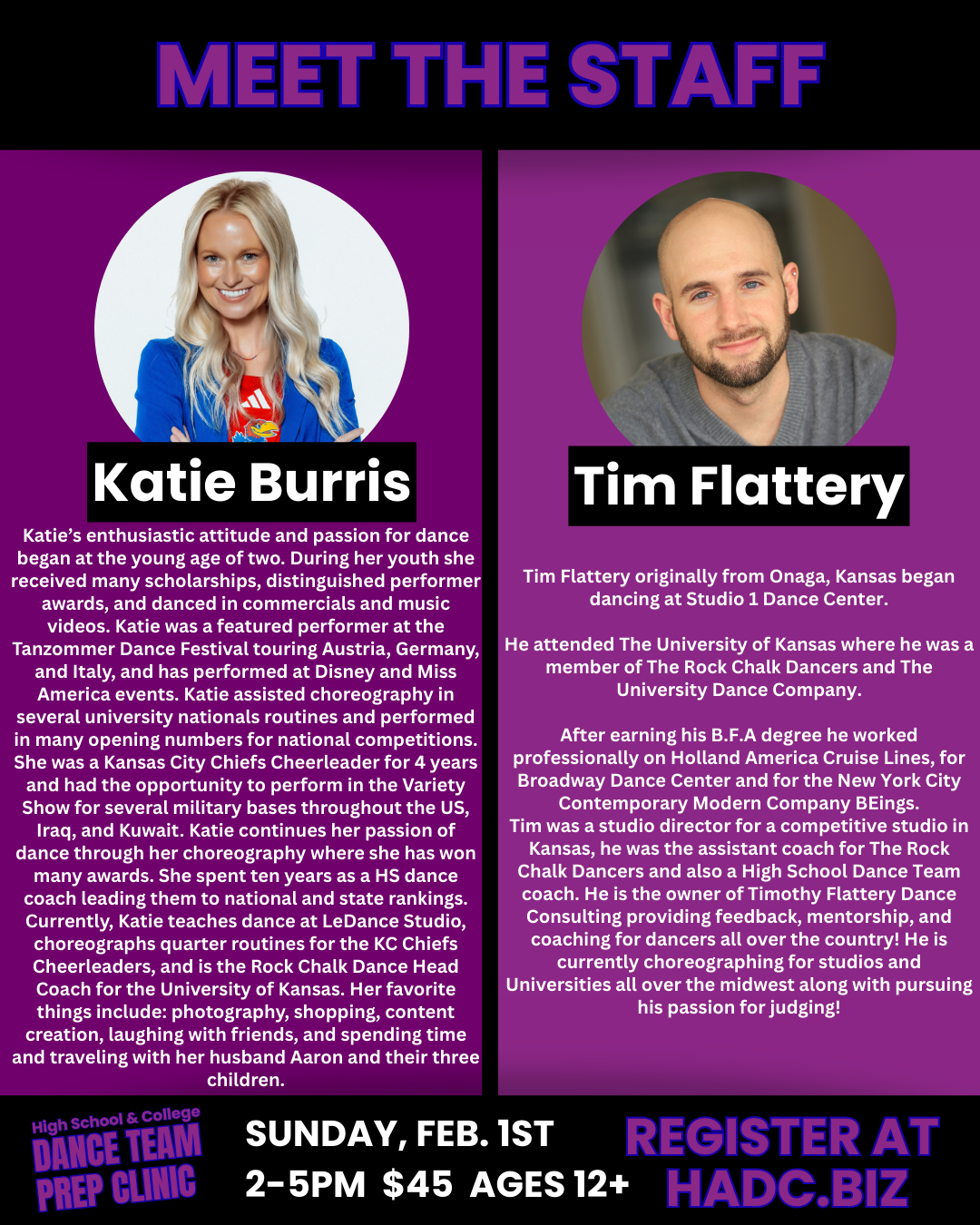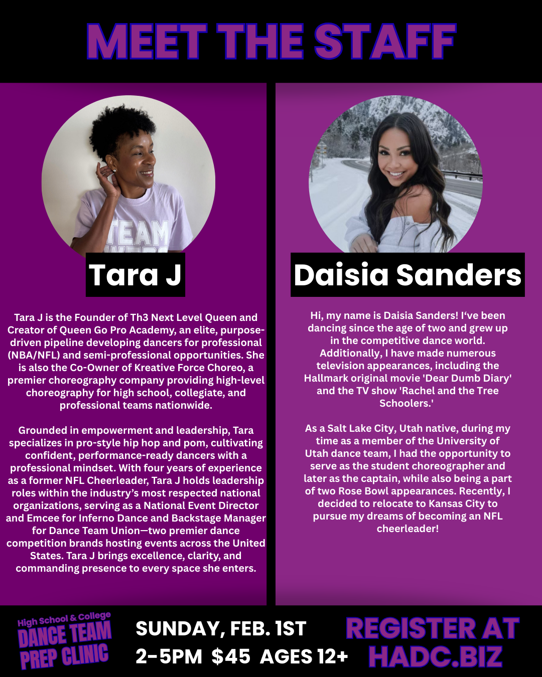 Join us at HADC for a pop up clinic featuring skills for high school and collegiate auditions. We are welcoming Katie Burris, Tim Flattery, Tara J, and Daisia Sanders to teach Technique, Hip Hop. Game Day/Pom, and Jazz for upcoming spring auditions for High School and College. Dancers must be ages 12+. Recommended to bring water, tennis shoes and jazz shoes or spins for technique.